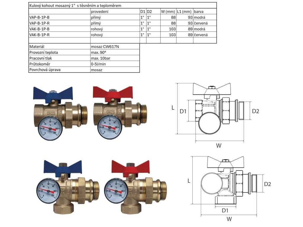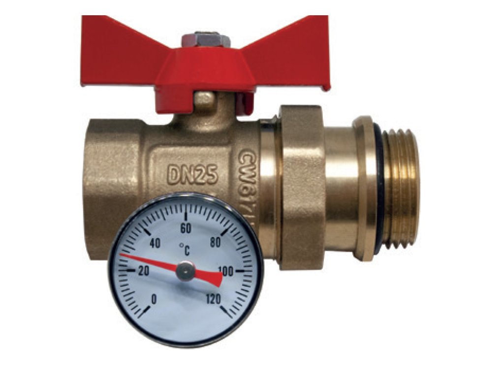 Guľový kohút mosadzný 1" priamy s tesnením a teplomerom - červený