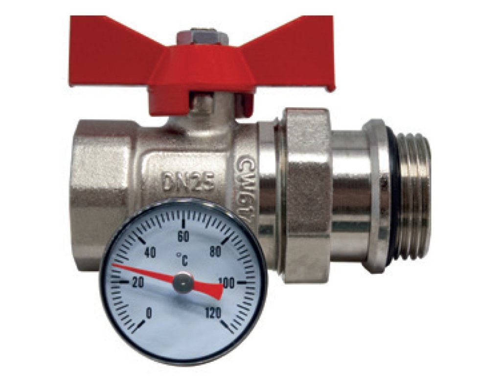 Guľový kohút niklovaný 1" priamy s tesnením a teplomerom - červený