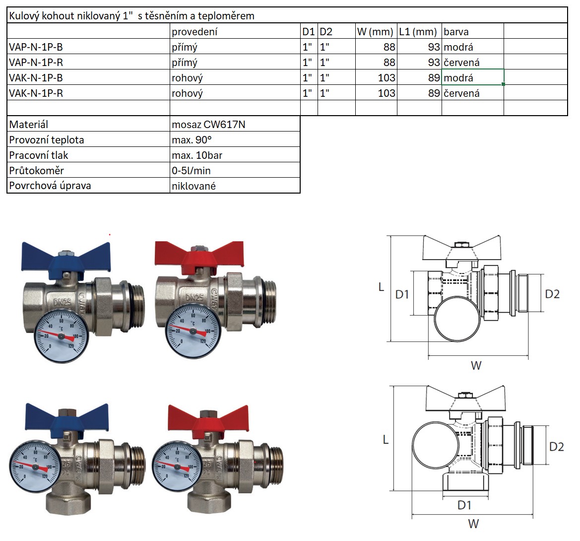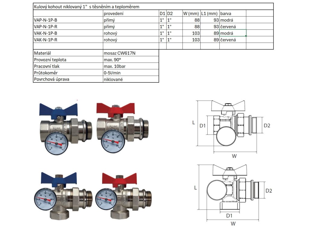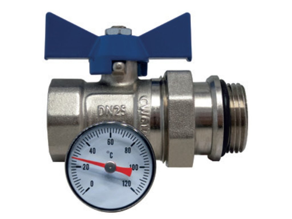 Guľový kohút niklovaný 1" priamy s tesnením a teplomerom - modrý